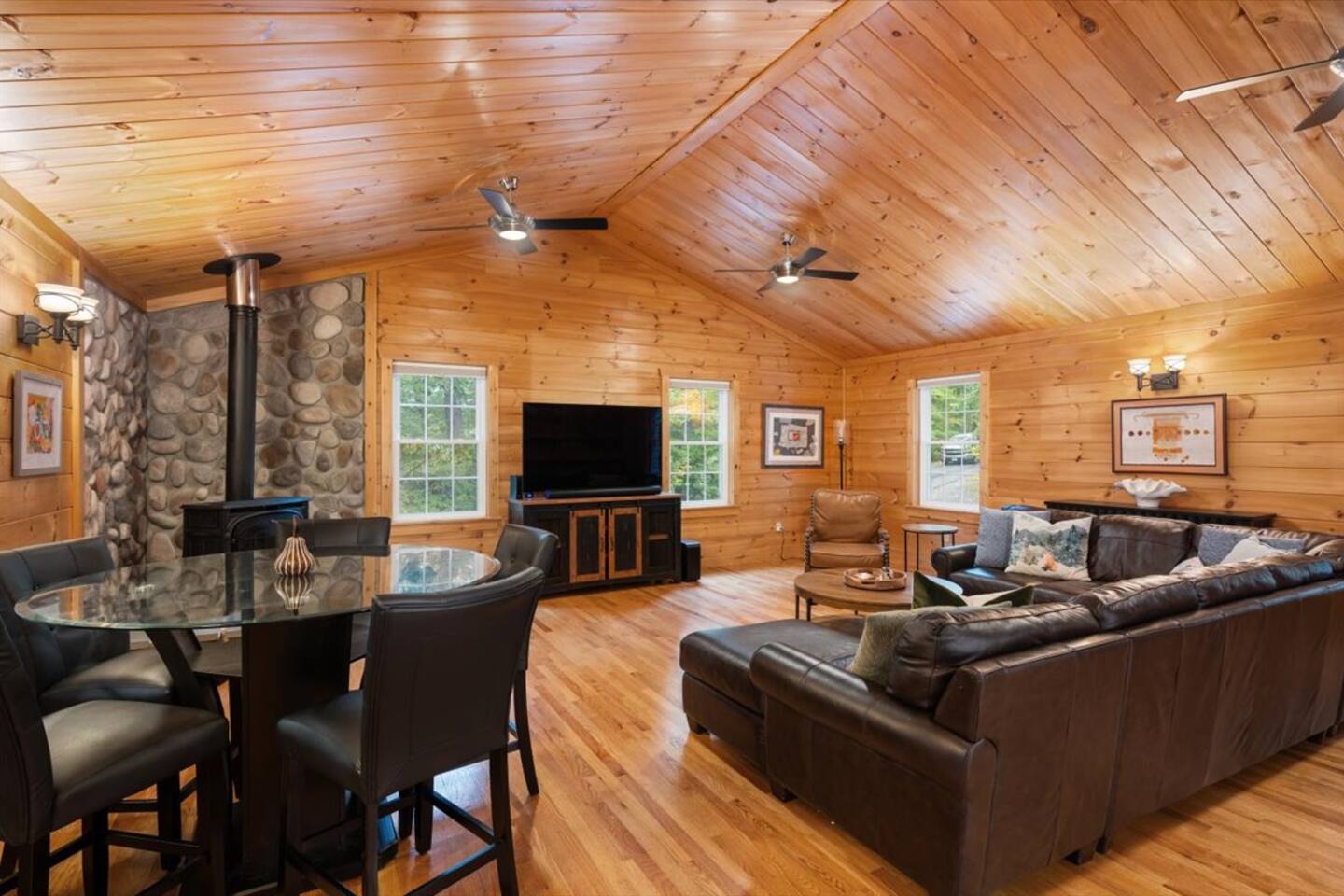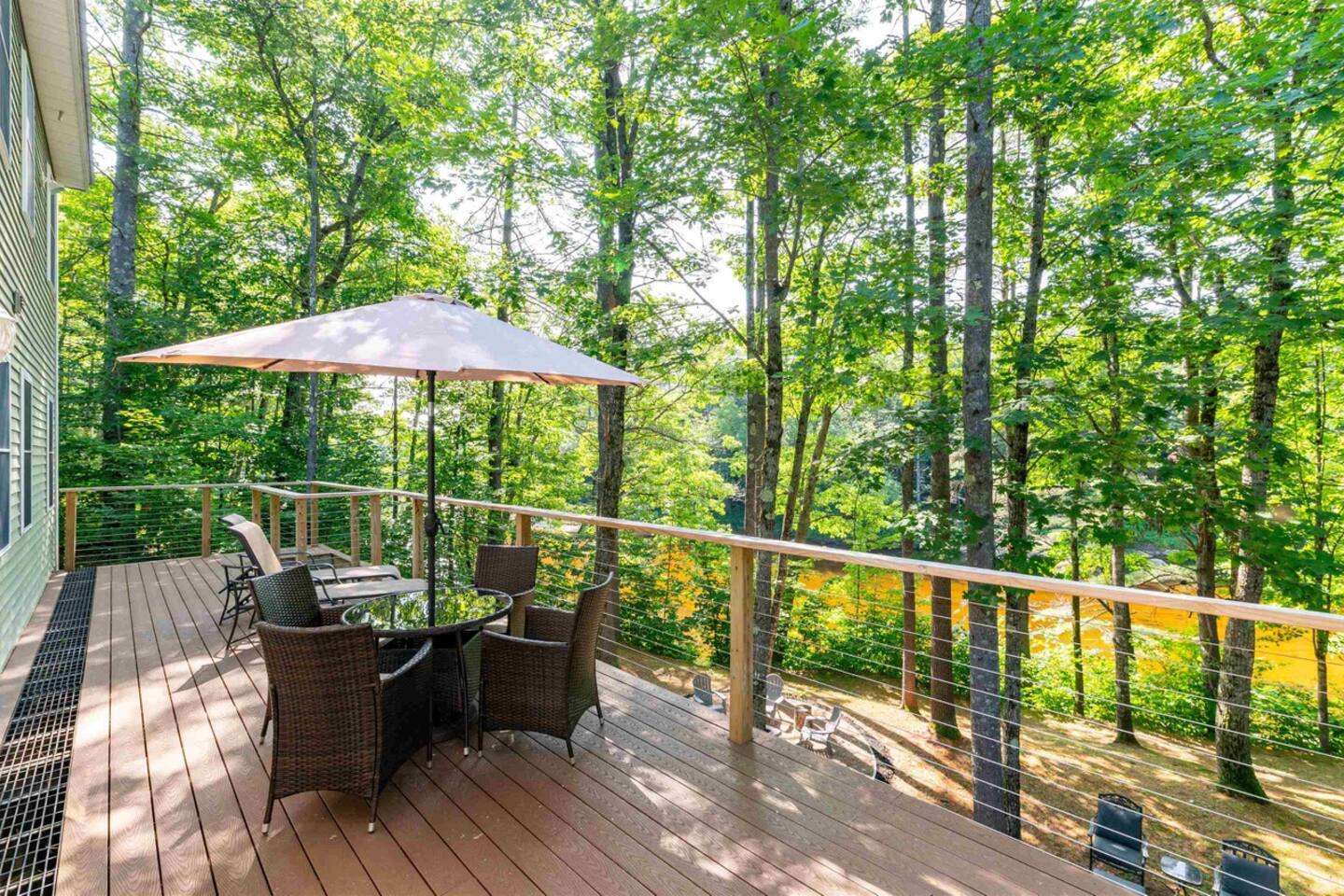 The main level features a queen bedroom and a twin room just off the chef’s kitchen, dining space, and cozy living room with a gas stove—ideal for morning coffee or evening downtime. Step outside to the screened sunroom, covered porch, sunny deck, or riverside fire pit to soak up the peaceful setting.