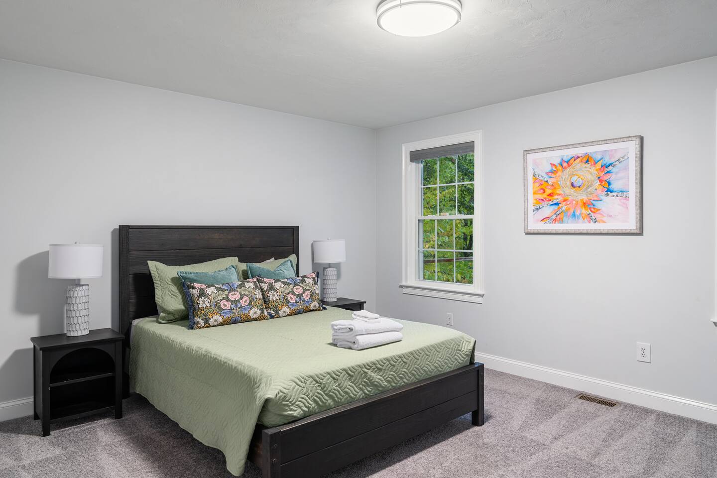 Upstairs, the serene king suite and twin bedroom share a full bath and a washer/dryer. All bedrooms are equipped with blackout shades for restful sleep.