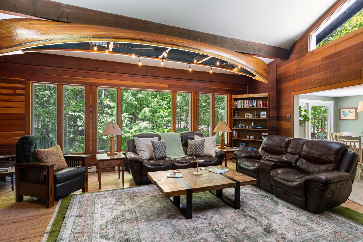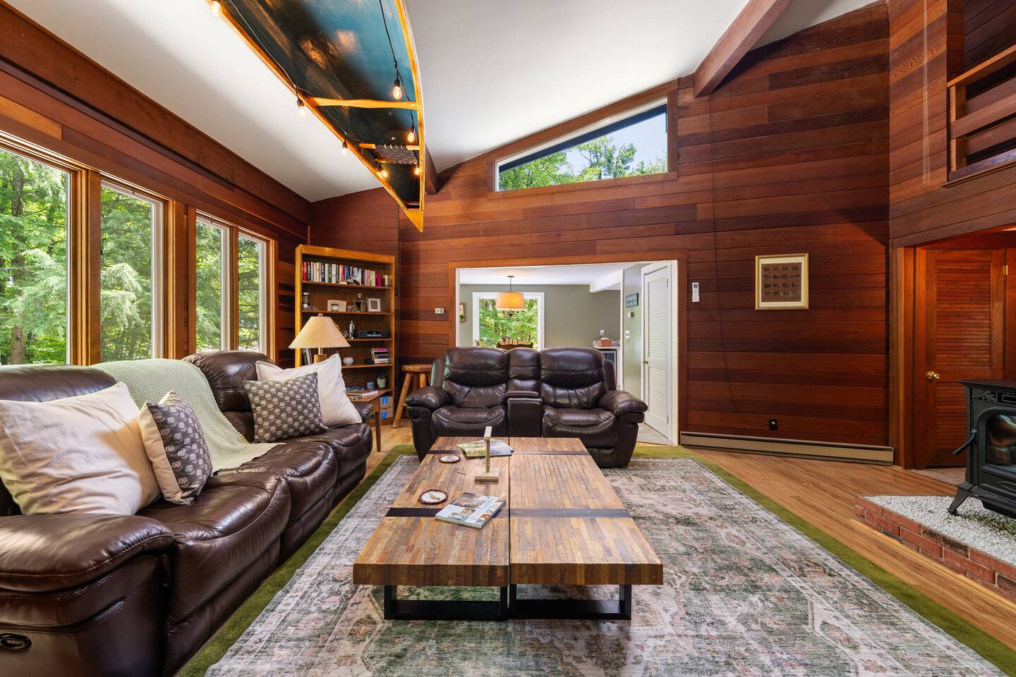 🛋 Open-concept living room with vaulted ceilings and a pellet stove for cozy evenings