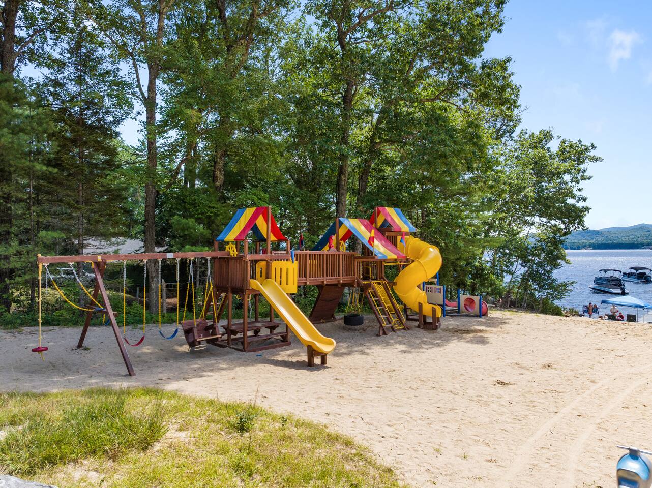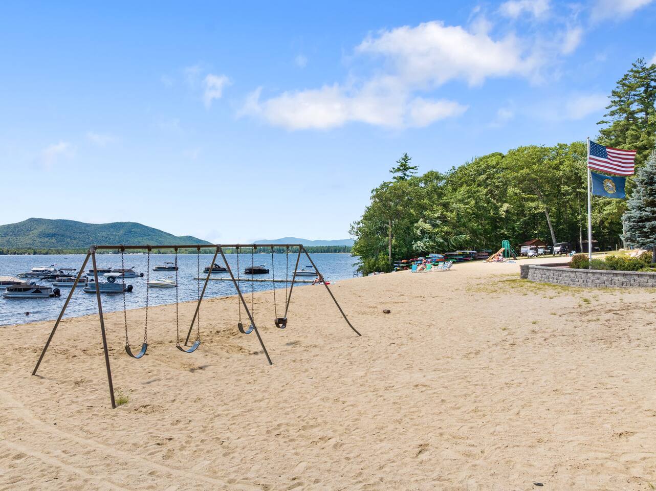 Mountview Association amenities, including the sandy beach, boat launch, playground, picnic areas, tennis, basketball, and pickleball courts