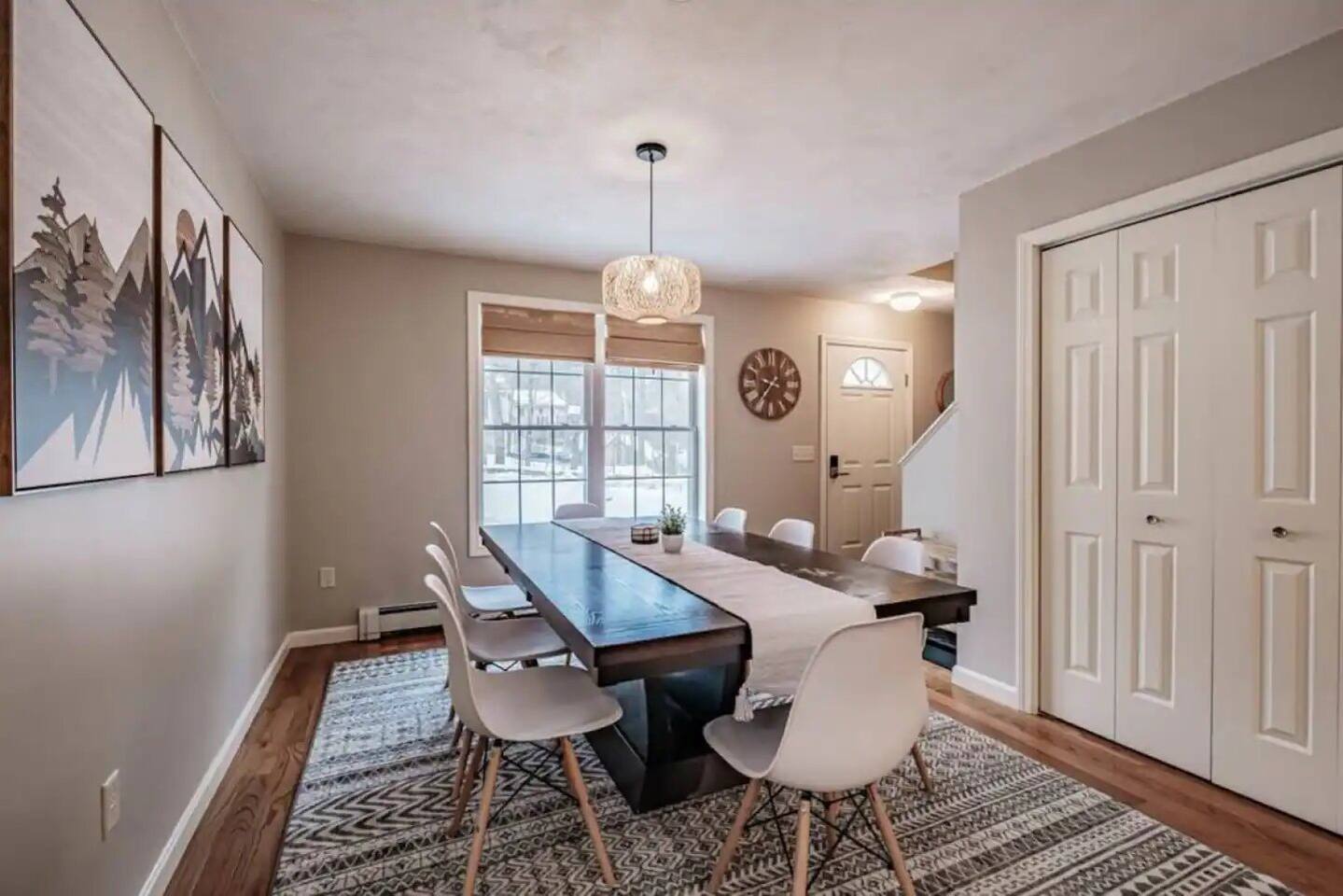 Unwind in this comfortable and thoughtfully appointed 3-bedroom, 1.5-bath home—perfect for relaxing after a day exploring the White Mountains. 🛏 Bedrooms (Sleeps 8) Primary Bedroom: Queen bed, AC unit, large closet Bedroom 2: Queen bed, warm and cozy decor Bedroom 3: Twin bunk bed with pull-out trundle—perfect for kids or extra guests All bedrooms are upstairs and feature large windows and natural light. 🛋 Living Room Bright and spacious with comfy sofas, an electric fireplace, smart TV, and window AC for warm summer days. 🍽 Dining Area Gather around the large table with seating for 8—ideal for family meals or game nights. 🍳 Kitchen Fully equipped with stainless steel appliances, cookware, coffee maker, and everything you need to prepare meals at home. 🚿 Bathrooms Full Bath (Upstairs): Tub/shower combo, bright and clean Half Bath (Main Floor): Conveniently located near the living space 🌿 Outdoor Space Enjoy a peaceful backyard with a babbling brook running behind the home. Sit out with your morning coffee or unwind with a drink after a day of adventure. Guest Access to Private Beach: Guests have full, private access to the entire home, as well as exclusive use of the Cranmore Shores Association beach on Pequawket Pond—a peaceful, family-oriented spot perfect for summer days in the sun. 🏖 Beach Details: Access is granted with a provided beach pass (required for entry)- please note that the association has not provided a pass for 2025 but has approved our guests to park. If you are asked for a pass (unlikely) tell them “it’s being mailed” Swim, relax, or picnic at this quiet private beach—just a short walk or drive from the home Roped-off swimming area for safety (no boats or fishing in swim zone) No pets, no smoking, and no lifeguard on duty—swim at your own risk Open daily from 6am to 10pm It's a wonderful place to enjoy the water without the crowds—ideal for families looking for a peaceful summer retreat. 📶 Other Amenities High-speed WiFi Smart TV AC units in the living room and primary bedroom Washer + dryer Private driveway (fits 2–3 cars)